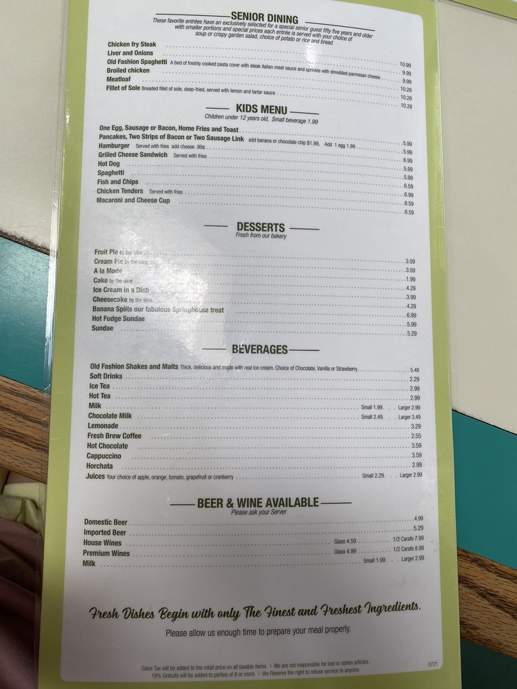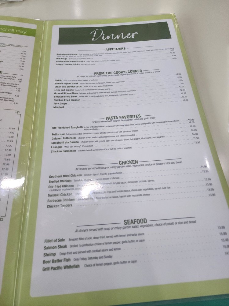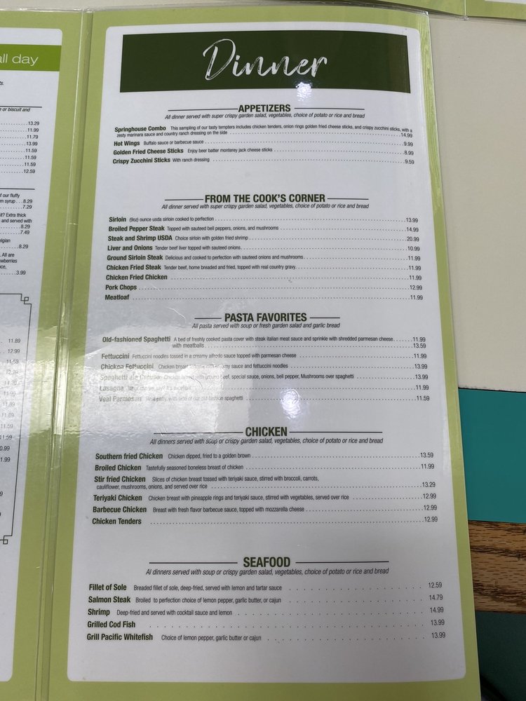 Spring House Restaurant Menu